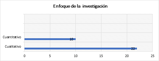 En la figura n° 2 entre los artículos investigados de acuerdo al enfoque se tiene al enfoque cualitativo, hay investigaciones en todas las categorías con 22 artículos y 10 artículos cuantitativos.