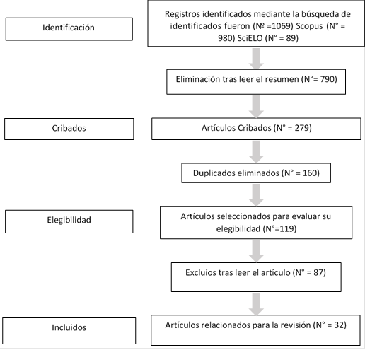 Se identificaron al inicio 1069 artículos solo de la base de datos correspondiente a Scopus y Scielo, se ha leído el contenido de cada artículo enfatizando el resumen y se eliminó 790 artículos, porque no tenía mucha relevancia con el tema, artículos de otros países que no eran de América Latina y por ser muy antiguos quedando 279 artículos cribados, luego se eliminó 160 por duplicidad, de igual manera se seleccionó los artículos para sistematizar y evaluar su elegibilidad un total de 119 artículos, después de leer minuciosamente los 87 artículos completos y no estaban claros referente a las políticas públicas educativas en América Latina se excluyó, solo quedando los 32 artículos que fueron leídos, comparados, analizados y se incluyó para el estudio de problemas y desafíos de las políticas públicas educativas de América Latina.