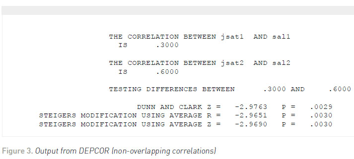 Let us suppose that the correlation between job satisfaction and salary at the beginning of the year was .30 and at the end of the year it was .60 for the 100 high school teachers. Moreover, the correlation between job satisfaction at time 1 and time 2 is .40; the correlation between job satisfaction at time 1 and salary at time 2 = .20; the correlation between job satisfaction at time 2 and salary at time 1 = .25; and the correlation between salary at time 1 and salary at time 2 = .50. The output from DEPCOR is shown in Figure 3 .