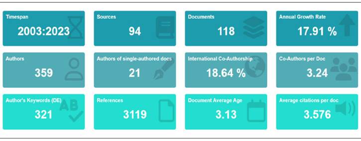 La producción involucra a 359 autores, con un promedio de 3.24 coautores por documento y un 18.64% de colaboración internacional. Esto sugiere una línea de investigación emergente pero creciente, con contribuciones desde diversos países. Las publicaciones evidencian un buen nivel de actualización, citando referencias con una antigüedad promedio de sólo 3.13 años.