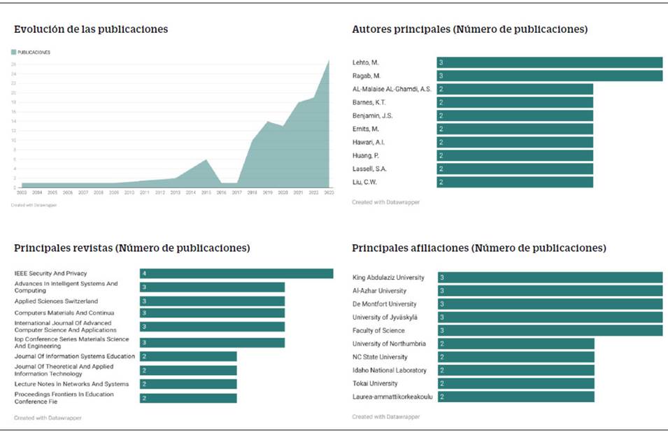 La evolución de las publicaciones sobre ciberseguridad revela una notable transformación a lo largo del tiempo. Hasta el año 2003, se observa un crecimiento gradual, lo cual evidencia poco interés en relación a esta temática. Sin embargo, a partir del año 2018, se produce un cambio significativo con un crecimiento exponencial en las publicaciones relacionadas con este campo, lo que implica que el abordaje científico en el contexto actual va en aumento por ser necesario.