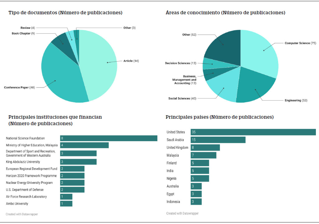 Nota. Principales indicadores bibliométricos relacionados con tipo de publicaciones, áreas del conocimiento, entidades financiadoras y países, con base en los metadatos de Scopus, procesados en la app https://app.datawrapper.de/