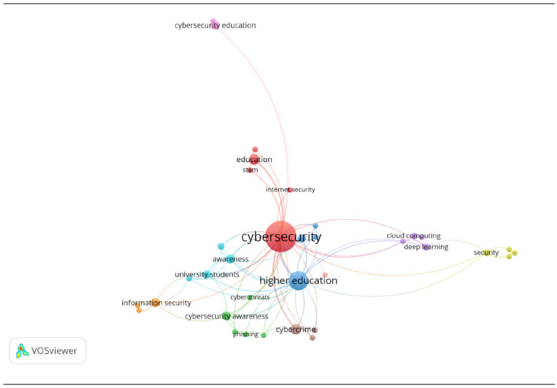 En la Figura 4, se aprecia el mapa semántico generado a partir del análisis de co-ocurrencias de palabras claves dentro de la colección de publicaciones. Esta representación visual destaca términos como ciberseguridad, seguridad, seguridad de información, seguridad de internet, amenazas cibernéticas. conciencia de educación en ciberseguridad, entre otros. Estos términos dentro de la red, con preponderancia en el tamaño de los nodos y sus relaciones permiten identificar las principales tendencias en la investigación en este campo. La seguridad, seguridad de información y seguridad de internet, indica que existe un énfasis en abordar la ciberseguridad dentro del ámbito de la educación superior. Las amenazas cibernéticas, evidencia interés en analizar los riesgos al que se está expuesto en el contexto virtual en relación a la ciberseguridad.