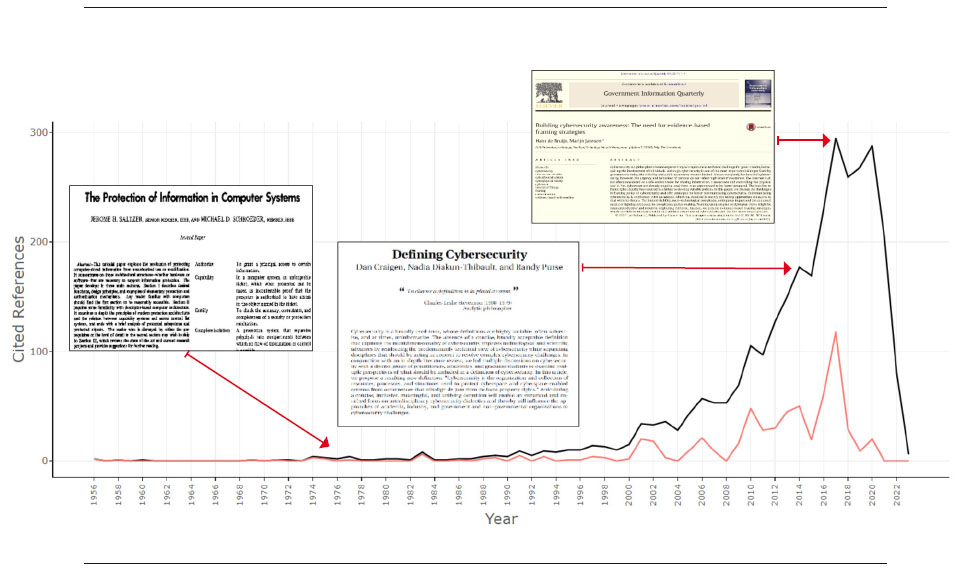 La aplicación de la espectroscopia del año de la referencia mencionada en la recopilación de trabajos sobre ciberseguridad posibilita la identificación de documentos que han sido citados de manera constante en investigaciones posteriores. Al rastrear el origen de estos conceptos esenciales, se ofrece una visión de la evolución y establecimiento del conocimiento en esta área (Figura 5).