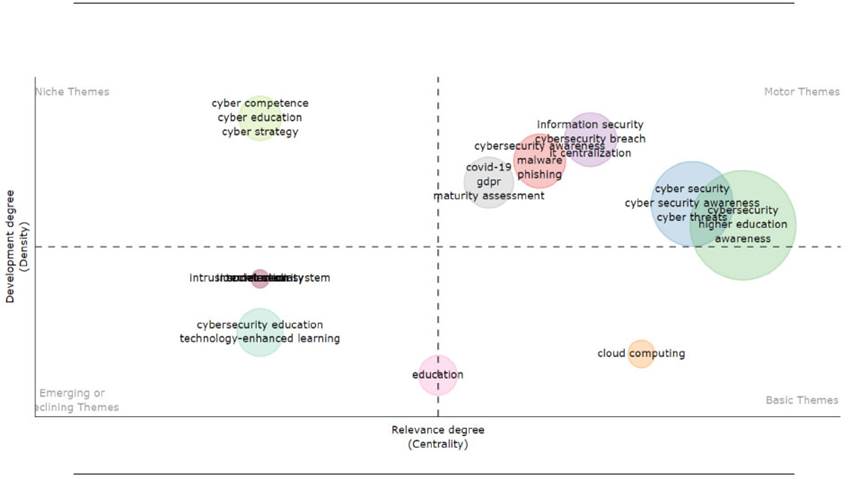 En la Figura 6, se observa el mapa estructural, lo cual permite analizar las tendencias de investigación respecto a la ciberseguridad. Este mapa ubica los conceptos seguridad de la información, ciberseguridad, ciberamenazas, conciencia en ciberseguridad, violación de la ciberseguridad, Reglamento General de Protección de Datos (GDPR) en el cuadrante "temas motores", lo cual indica que son líneas de investigación muy activas dentro del campo de la ciberseguridad. Esto concuerda con lo que se observa en el mapa semántico, donde estos términos se presentan como conceptos centrales y están fuertemente relacionados entre sí. Por tanto, ambos mapas evidencian el papel central que tiene el estudio de la ciberseguridad en el contexto de la educación superior, por lo que esta línea de investigación enfatiza el abordaje desde diferentes áreas del conocimiento humano.