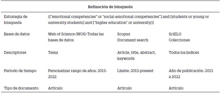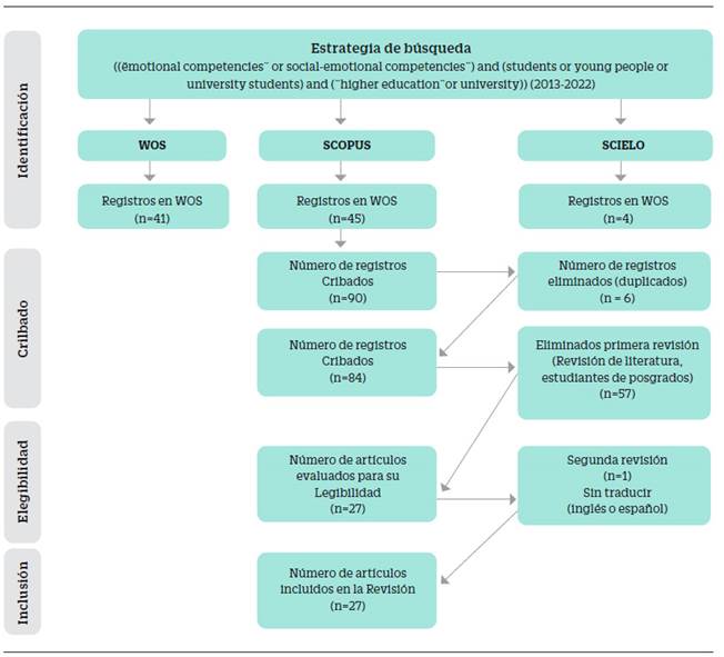 Los criterios de inclusión planteados para realizar la búsqueda de los artículos fueron: a) publicaciones empíricas de corte cualitativa, cuantitativa y mixta, que reportan investigaciones sobre competencias emocionales o socio-emocionales en estudiantes universitarios de pregrado; b) artículos científicos publicados en bases de datos Web of Science, Scopus y SciELO; y c) artículos publicados en el periodo de tiempo comprendido entre los años 2013 y 2022.