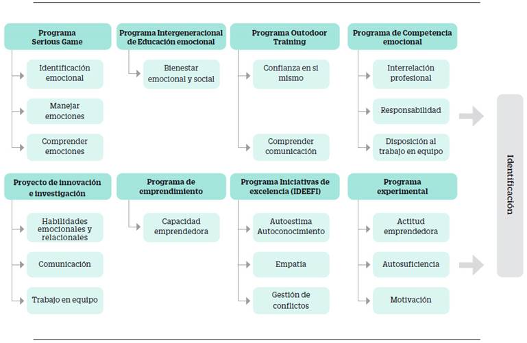 En primer lugar, la categoría de Competencia emocional, agrupa cinco programas, entre los que se cuentan a) programa Serious Game (Oliveira et al., 2021 ); b) programa intergeneracional de educación emocional (Torrijos & Sárate, 2021); c) programa outdoor training (Molina-Gómez et al., 2019 ); d) programa de competencia emocional en ingeniería (Ishkov & Manguera, 2015 ); y e) programa de emprendimiento (Huezo-Ponce et al., 2021 ).
