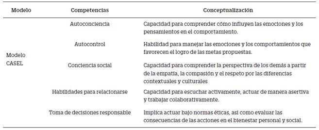 En la Tabla 1, se muestran las áreas de competencias definidas por CASEL, las cuales han sido planteadas como orientaciones generales para que tanto los profesionales de la educación como los investigadores, promuevan los aprendizajes del estudiantado de los diversos niveles educativos.