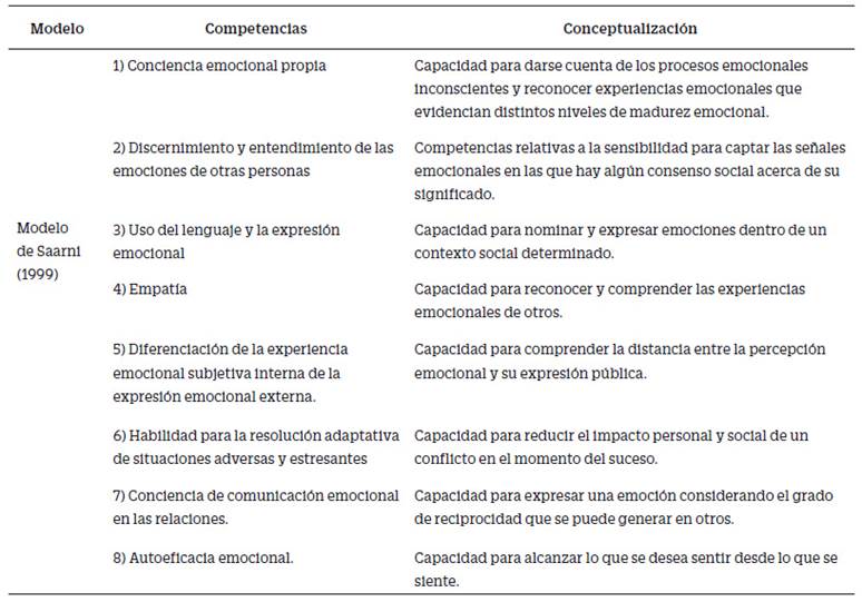 Para formular el modelo de competencias emocionales, Saarni (1999) retoma tres teorías cuyo punto central es la emoción: el modelo relacional, el modelo funcionalista y el socioconstructivista. En la Tabla 2, se presenta este modelo que ha sido un ícono para los autores que han seguido esta línea de trabajo.