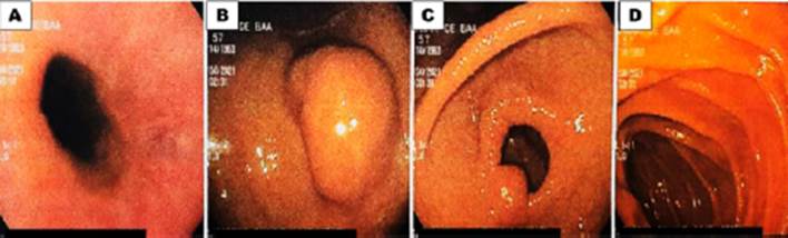 Figura 1 A. Eritema en cuerpo. B. Lesión submucosa en cuerpo. C. Lesión submucosa en antro. D. Eritema en duodeno.