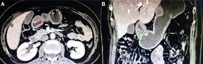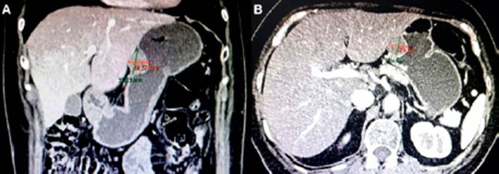Figura 3 A y B. Se aprecia lesión en el antro gástrico con cierta captación a la sustancia de contraste, de bordes bien definidos, mide 24.94 mm de diámetro cráneo-caudal x 20.13 mm de diámetro ántero-posterior x 18mm de diámetro transversal.