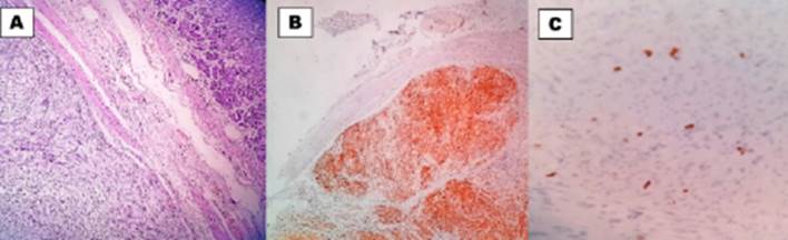 Figura 4 GIST intramuscular patrón fusocelular, HE 10X. B. CD 117 positivo, 10X. C. KI67 postiivo 4%, 40X.
