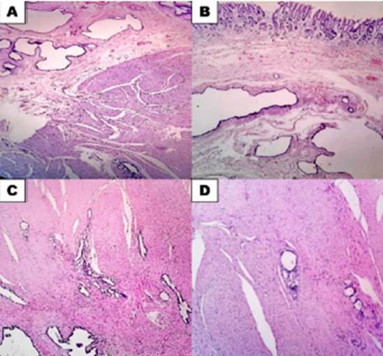 El adenomioma gástrico es una tumoración benigna rara, constituida por tejido muscular hipertrofiado con presencia de glándulas sin atipia intramusculares8. En 1903, Magnus-Alsleben, reportaron cinco casos de tumores mioepiteliales(9, 10). A los adenomiomas gástricos e intestinales, en la literatura se los ha denominado de diferente maneras, como hematomas mioepitelial, mioglandular, adenomiomatoso, algunos autores consideran como parte de la heterotopía pancreática; sin embargo, la diferenciación glandular aleja el origen pancreático11. Se presenta en cualquier grupo etario, más frecuente en la cuarta y quinta década de la vida. Con presentación gástrica prevalente seguida de intestino delgado y grueso. Asociado a Gastritis quística profunda, como causa de una diverticulosis polipoidea11.