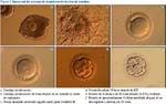 Habiendo iniciado menstruación el 15 de octubre de 2011, se administró 150 UI de FSHr, el segundo, tercero y cuarto día del ciclo. No se administró hCG para activar la maduración de los ovocitos. El octavo día del ciclo se realizó aspiración folicular bajo sedación endovenosa, con aguja 18 de un solo lumen (Vitrolife). El diámetro folicular encontrado fue de 6 a 7 mm, sin evidencia de folículo dominante. Se colectó cuatro complejos cúmulo-ovocitos (CCO), que fueron cultivados en medio de maduración que contenía 75 mUI/mL de FSHr y 100 mUI/mL de hCG (Pregnyl, Schering-Plough), suplementado al 10% con suero inactivado de la paciente. Treintaiséis horas después, los CCO fueron evaluados y los ovocitos en metafase II fueron inseminados mediante ICSI y cultivados en medio LifeGlobal. Dieciocho horas después del ICSI, se evidenció fecundación en los cuatro ovocitos, manteniéndolos en el mismo medio por 24 horas más. Como existía un desfase entre el desarrollo embrionario y el del endometrio, se decidió la congelación de los embriones. Cuatro embriones entre cuatro a seis células fueron congelados por vitrificación (4) en el dispositivo McGill Cryoleaf™ (Origio) y almacenados bajo nitrógeno líquido.