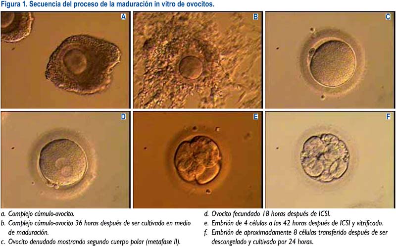 La presente comunicación informa la aplicación exitosa de la maduración in vitro de ovocitos en el tratamiento de infertilidad en una paciente con amenorrea, con historia de anorexia nervosa y resistencia a la inducción de ovulación. En la actualidad, la MIV de ovocitos está siendo utilizada en pacientes exclusivamente con OP/ SOP y con la utilización de hCG previa a la aspiración de los folículos antrales (5). La paciente sometida a MIV de ovocitos en nuestro centro no reflejó la condición de OP/SOP, más aún presentó condiciones fenotípicas contrarias a las descritas para esta patología (en conformidad con los criterios de Rotterdam 2003) (6). A pesar de reportes que manifiestan la ventaja de utilizar hCG previa a la obtención de ovocitos para su ‘maduración in vitro’ (7-10), también se ha manifestado que la hCG interrumpe la comunicación entre las células foliculares y el ovocito, comunicación importante para la adquisición de un adecuado potencial de desarrollo embrionario (11). En nuestro protocolo de MIV no utilizamos hCG in vivo; hacemos madurar completamente los ovocitos in vitro sometiéndolos a la presencia de FSH y hCG en el medio de cultivo, habiéndose encontrado resultados satisfactorios con esta estrategia (12). La ventaja de combinar MIV de ovocitos con la vitrificación es la de posponer la transferencia embrionaria cuando el endometrio esté suficientemente receptivo.