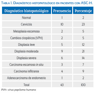 Cervical cancer is the most prevalent neoplasm in women in our country. The Papanicolaou test is used as a screening test, and is reported using the Bethesda System. In this system, the ASC-H (atypical squamous cells cannot exclude HSIL-high grade squamous epithelial lesions) category designates cases with atypical squamous cells, where the changes are suggestive of a high grade squamous intraepithelial lesion but insufficient for a definitive cytopathologic interpretation. It becomes important to determine the cyto-histological correlation in this group. Objective: To correlate cytopathologic results reported as ASC-H with histopathological diagnoses. Designs: Descriptive, cross sectional retrospective study. Material: Cervicovaginal cytology and histology. Method: We reviewed the cases with a cytologicalpathological study between January 2013 and July 2015 and with a histopathological study until a year later. The population and diagnoses were determined using the database. Histopathological diagnosis was considered as the gold standard. Main outcome measures: Cyto-histological correlation in ASC-H cases. Results: Out of the total of 53 716 cervical cytology studies performed during the study period, 119 were classified as ASC-H; 43 (0.07%) cases met the inclusion criteria. The age ranged between 22 and 70 years, with an average of 43.8 years; 42% of ASC-H cases were diagnosed as presenting CIN2 and CIN3 in the histopathological study. Conclusion: This study showed correlation between ASC-H results and high-grade intraepithelial lesions (CIN2 and CIN3), in line with findings in the literature.