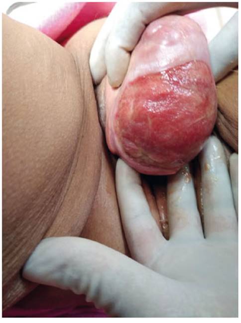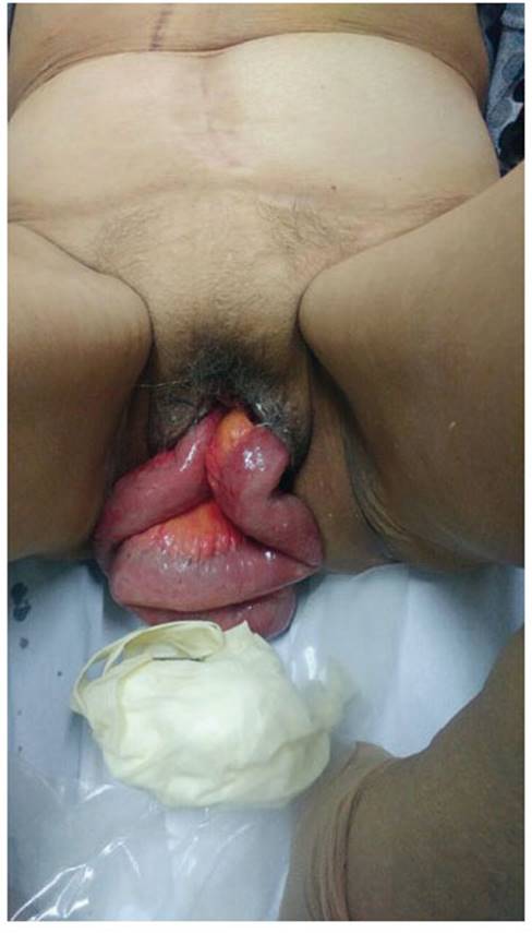 Se presenta el caso de una mujer de 63 años que llegó a emergencia por protrusión de las vísceras abdominales por la vagina, refiriendo que 12 horas antes, realizando labores domésticas, sintió un intenso dolor abdominal tipo cólico que la obligó al reposo inmediato. Al mismo tiempo observó asas intestinales saliendo por sus genitales. Fue evacuada a un establecimiento primario, en donde redujeron la víscera prolapsada, colocaron un tapón vaginal y la refirieron al hospital. A la evaluación de ingreso se encontró el abdomen blando, depresible, con ligero dolor a la palpación profunda en hipogastrio. En la inspección de los genitales se evidenció el intestino delgado por fuera del introito vaginal (figura 1), aparentemente sin zonas de isquemia. Se irrigó con agua estéril, se redujo la evisceración, se colocó un tapón de soporte y se preparó para cirugía.