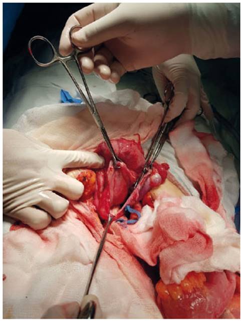 En la laparotomía se realizó evaluación total de los intestinos para confirmar su viabilidad y descartar zonas de isquemia. En el fondo de saco de Douglas se observó una solución de continuidad en sentido transversal de aproximadamente 15 cm, que comunicaba con la vagina. Los bordes eran edematosos y la pared presentaba áreas blanquecinas engrosadas no sangrantes (figura 2). Por estas características, se recortó los bordes de esta abertura con un margen de 2 cm, muestra que se envió a estudio patológico. Se suturó la lesión en dos planos, el primero con puntos imbricados usando vicril 1 y el segundo plano en sutura de Lembert continuo con vicril 0.