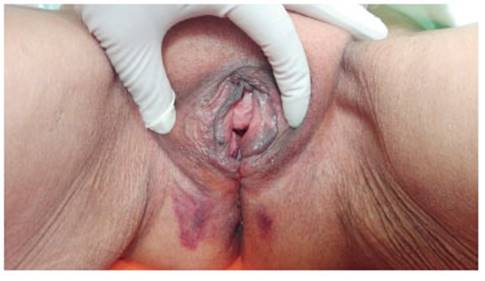Esta paciente había sido diagnosticada de prolapso genital de grado III y úlcera vaginal posterior tres meses antes; se le indicó estriol tópico.