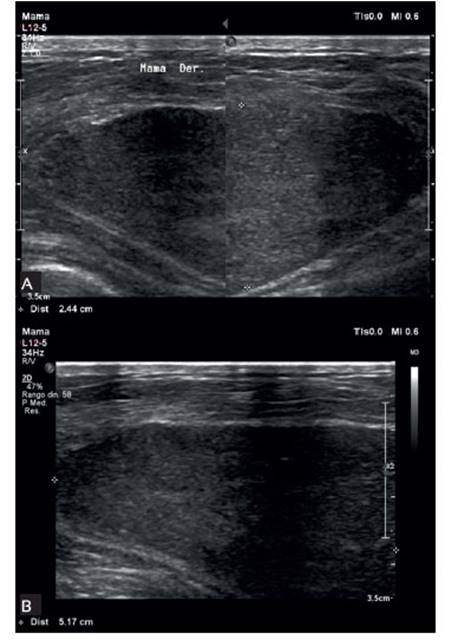 Al examen de ingreso pesaba 53 kg, talla 1,54 m, índice de masa corporal 22,3, colaboradora durante la evaluación. Se observó regular estado general, de nutrición y de hidratación. La mama derecha, en estadio Tanner 4, estaba ocupada por masa única de bordes definidos de 9 x 6 cm, radio 6 hasta radio 12, móvil, no dolorosa, de consistencia dura y que deformaba el pezón y la areola. La mama izquierda, estadio Tanner 4, no mostraba alteraciones. La bioquímica, el examen hematológico y de orina fueron normales. En la ecografía mamaria derecha se observó masa ovalada circunscrita con sombra acústica, de 9 x 6 cm en radio 11 y 12 (Figura 1).