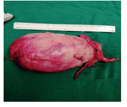 El tratamiento quirúrgico consistió en la exéresis del tumor (Figura 2) mediante abordaje submamario (Figura 3). No se evidenció complicaciones durante el postoperatorio, y fue dada de alta luego de 1 día de hospitalizada, con analgésicos, antibióticos y vendaje de mamas. Acudió a control después de 72 horas del postoperatorio para retiro del vendaje. Después de una semana se le retiró las suturas. En el examen físico, la herida operatoria estaba afrontada y sin flogosis.
