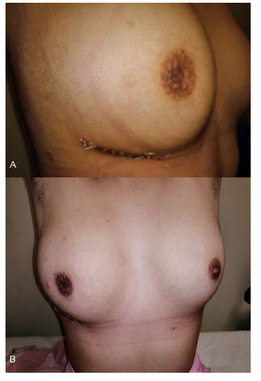 Figura 3 a. incisión submamaria derecha. b. control a la semana.