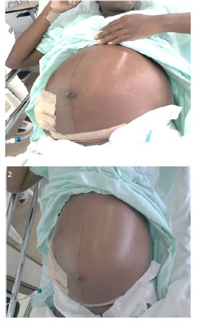 La paciente tenía 22 años, de raza afroamericana y procedente de Buenaventura, en su segundo embarazo, con 33,1 semanas de gestación y cuadro clínico de 12 días consistente en cefalea progresiva en intensidad que no mejoró con analgésicos, asociada a edema en miembros inferiores, hiperreflexia y cifras tensionales en crisis hipertensiva (186/116 mmHg). Se inició manejo con labetalol, sulfato de magnesio e inductores de maduración pulmonar fetal. Debido a la persistencia de las características graves, se finalizó el embarazo con cesárea de urgencia. Durante la cirugía se evidenció líquido ascítico en la cavidad abdominal.
