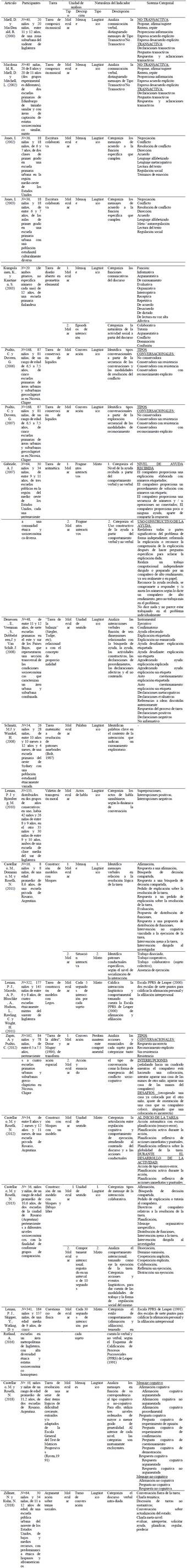 Este proceso de selección derivó en un total de 19 artículos empíricos. En relación a cada artículo se relevó el/los sistemas categoriales propuesto/s para el análisis de la interacción sociocognitiva, además de otras características secundarias (ver más adelante el procedimiento de análisis). La unidad de análisis estuvo constituida por cada sistema categorial utilizado para codificar la interacción sociocognitiva, presente en cada artículo seleccionado. En función de ello, como cinco de aquellos 19 artículos habían presentado dos sistemas cada uno, la muestra final quedó definitivamente conformada por 24 sistemas categoriales. La Tabla 1 presenta una descripción de los sistemas analizados.