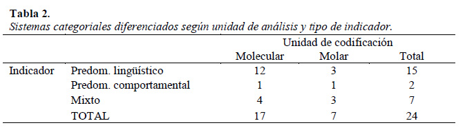 Como puede apreciarse en la tabla, se encontró una mayor frecuencia de sistemas categoriales cuyos indicadores son de tipo lingüístico (15), seguido por siete sistemas con indicadores de tipo mixto, y por último, dos de tipo comportamental. El tipo más frecuente de unidad de análisis de los sistemas categoriales analizados es el tipo molecular (17), superando el doble de los sistemas categoriales que presentan unidades de análisis de tipo molar (7). Se observa una mayor predominancia de sistemas categoriales cuyo indicador es lingüístico y su unidad de análisis es de tipo molecular (12). En contraste con lo mencionado, los sistemas categoriales menos frecuentes son aquellos cuyos indicadores son de tipo comportamental, tanto los que presentan unidad de análisis de tipo molecular (1) como de tipo molar (1).