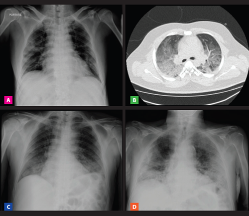 Figura 1 Estudios radiológicos de pacientes fallecidos por COVID-19, en un hospital terciario de Lima, Perú (A) Varón 61 años con diabetes e hipertensión arterial, muestra patrón intersticial en vidrio esmerilado bilateral. (B) Varón 26 años antecedente de asma bronquial y obesidad, con predominio de lesiones intersticiales en vidrio esmerilado. (C) Varón 66 años sin antecedentes y con patrón alveolo-intersticial bilateral. (D) Mujer 97 años antecedente de hipertensión arterial, con lesiones alveolo-intersticiales bilaterales