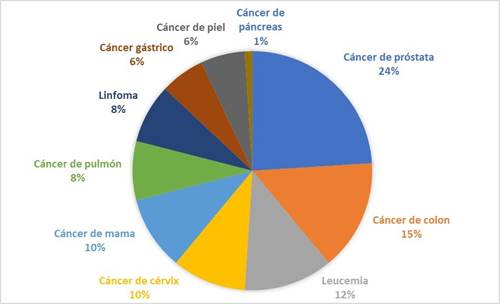Elgráfico 1presenta la distribución de pacientes según el tipo de cáncer. Los pacientes con tumores sólidos correspondieron al 79,8%. Dentro de los tumores sólidos, el cáncer de próstata fue el más frecuente (24%), seguido del cáncer de colon (15%).