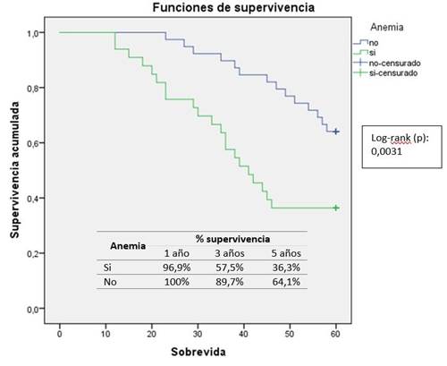 La anemia es una manifestación frecuente en pacientes oncológicos y está relacionada significativamente con la supervivencia global a 5 años. La anemia severa, la edad mayor de 70 años y el estadio clínico avanzado, mostraron relación con una mayor mortalidad. Estudios confirmatorios prospectivos son necesarios.
