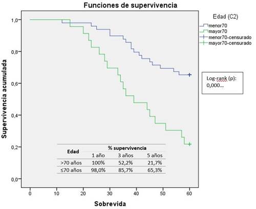 En elgráfico 3se muestran las curvas de supervivencia por la edad. La mayor proporción de decesos se produjo en pacientes mayores de 70 años, con una supervivencia a los 3 años del 52,2% y a los 5 años del 21,7%. La diferencia entre las curvas de supervivencia fue estadísticamente significativa (p=0,000).