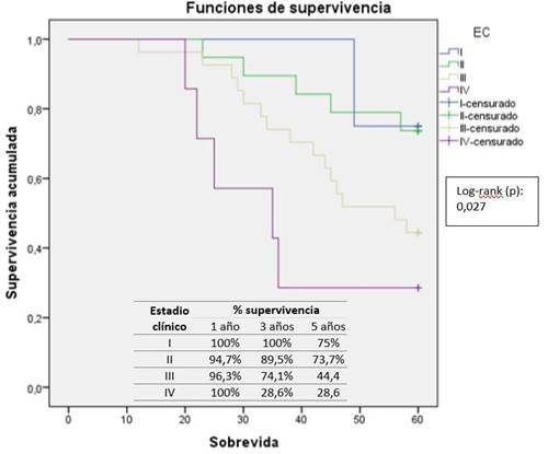 En los pacientes con neoplasias sólidas, se evaluó la sobrevida según el estadio clínico. (Gráfico 4) El 71,4% de pacientes en estadio IV presentaron el evento con una menor supervivencia a los 3 y 5 años (28,6%). Los pacientes en estadio I de enfermedad presentaron la mayor supervivencia a los 5 años (75%). La diferencia entre las curvas de supervivencia para cada estadio fue significativa con un p valor de 0,027.