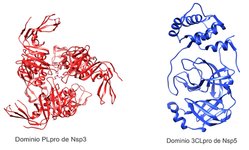 Figura 2. Estructura tridimensional de proteasas del SARS-CoV-2. Dominio PLpro (papain-like protease) de Nsp3 (PDB: 6W9C) y Nsp5 (PDB: 6Y2E) con su dominio 3CLpro (3-chymotrypsin-like protease). Elaborado con UCSF Chimera--a visualization system for exploratory research and analysis. Pettersen EF, Goddard TD, Huang CC, Couch GS, Greenblatt DM, Meng EC, Ferrin TE. J Comput Chem. 2004 Oct;25(13):1605-12.