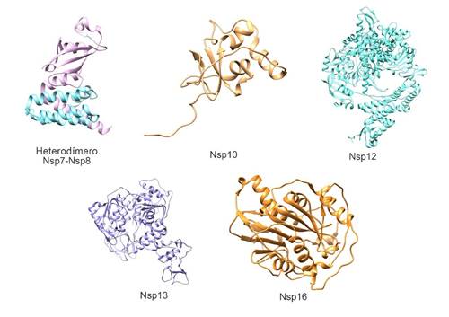 Las 16 proteínas no estructurales provienen del clivaje proteolítico de las poliproteínas PP1a y PP1ab expresada por ORF1a y ORF1ab16, respectivamente. Estas cumplen un rol fundamental en la replicación del virus dentro de las células huésped y algunas de ellas son el objetivo de diversos fármacos en desarrollo7,25.
