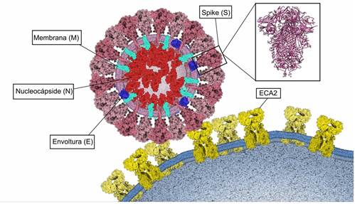 Figura 4. Unión del SARS-CoV-2 a ECA2. Proteínas estructurales Spike (S) de color rosado, Membrana (M) de color turquesa, Envoltura (E) de color azul y Nucleocápside (N) de color rojo. Estructura tridimensional de la proteína Spike (PDB: 6VXX) y su unión a ECA2 (color amarillo) en la membrana de la célula huésped. Elaborado con Gardner A, Autin L, Barbaro BA, Olson AJ, Goodsell DS. CellPAINT: Interactive Illustration of Dynamic Mesoscale Cellular Environments. IEEE Comput Graph Appl. 2018;38(6):51-66.