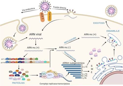 Figura 5. Mecanismo de interacción y patogénesis del SARS-CoV-2. Entrada del SARS-CoV-2 a través de 2 vías: endocitosis (a la izquierda) y fusión directa (a la derecha). El ARN genómico ingresa a la célula y el ARN monocatenario en sentido positivo (ARN mc +) se traduce en las poliproteínas pp1a y pp1ab a partir de las regiones ORF 1a y ORF 1ab. Posteriormente, un proceso de autoclivaje por 3CLpro y Mpro, dará lugar a las 16 proteínas no estructurales (Nsps), que formarán el complejo replicasa transcriptasa (RTC), que producirá ARN monocatenario de polaridad negativa a partir de la cadena positiva; que se asociará con la proteína de nucleocápside. Por otra parte, el complejo RTC, sintetizará ARN subgenómico (ARN sg) que codificarán las proteínas S, M y E, ensambladas en retículo endoplasmático antes de ser transportadas al compartimiento RE-Golgi, donde se asociará con el nuevo ARN genómico y la proteína N. Finalmente se exportará en forma de vesículas para la posterior liberación del nuevo virus. Elaborado con https://biorender.com/