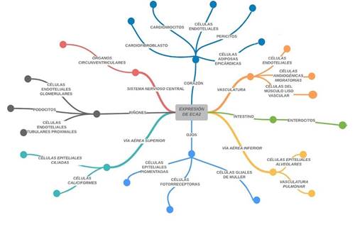 Como ya se mencionó anteriormente, el SARS-CoV-2 utiliza como receptor a la ECA2, la cual está expresada en diferentes células del sistema vascular, sistema nervioso central, ojos, vías aéreas superiores, corazón, pulmones e intestino; siendo más vulnerables los últimos tres66(Figura 6).