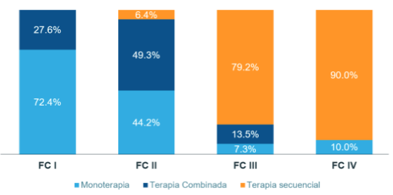 Este estudio presenta que los pacientes con mayor deterioro funcional (clase funcional III y IV) requieren mayoritariamente terapia combinada y por estar más propensos a hospitalizarse incluso con estancia más prolongada se genera más costo no solo por uso de fármacos sino de causa hospitalaria.