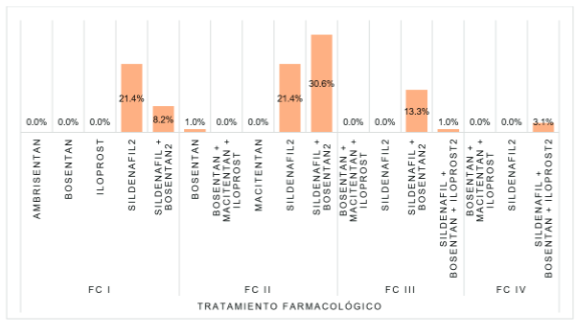 Los fármacos utilizados en pacientes con clase funcional I y II, concuerdan con lo normado en las guías internacionales, no obstante existe un grupo de pacientes que aun en clase funcional II requiere terapia con fármacos que utilizan la vía de las prostaglandinas, específicamente un agonista de los receptores IP selectivos que han demostrado reducción de morbimortalidad en esta fase19. En pacientes con clase funcional III y IV, aún se presentan casos con uso de monoterapia, lo cual revela el limitado acceso a fármacos recomendados en este nivel de la enfermedad, asimismo aun cuando la mayoría de pacientes tiene indicada una terapia secuencial, ésta es restringida en su mayoría a Sildenafilo y Bosentan (Figura 2) dejando en claro el riesgo de progresión de la enfermedad en etapas avanzados dada la necesidad de contar con análogos de prostaglandinas en este grupo de pacientes. Es de especial atención el grupo de pacientes en clase funcional IV, quienes tienen un alto riesgo de muerte o requerir trasplante, para los que la indicación de análogos de prostaglandinas deben ser aplicados por vía parenteral20, fármacos que aún no están disponibles en el mercado nacional.