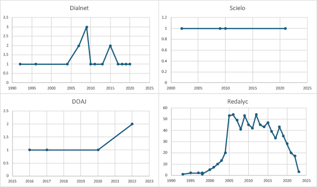 En un análisis general, se tiene que, es a partir del año 2006, cuando se comienza a observar que el número de publicaciones va en aumento —efecto que sigue lo establecido en la ley de Price—, el crecimiento de la información es de carácter exponencial, incluso después de diez a quince años la información se duplica (De Solla Price, 1963). Los años con mayor productividad fueron el 2012 (54 artículos en Redalyc), 2009 (3 artículos en Dialnet) y el 2022 (2 artículos en DOAJ).