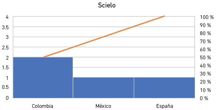 En la evaluación realizada en Scielo, se destaca la notable productividad de Colombia, con la publicación de dos artículos. Tal país muestra un compromiso continuo con la investigación y la producción académica. Luego de Colombia, se encuentran México y España, ambos países tienen una presencia significativa en el ámbito de la investigación con un artículo en cada caso (véase la Figura 2).