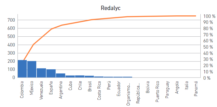 En la plataforma Redalyc, Colombia encabeza la lista con una impresionante cantidad de 214 artículos (véase la Figura 4). Le siguen de cerca México y Venezuela, lo que demuestra un alto nivel de actividad investigativa en estas naciones. España también está presente en la lista y resalta su contribución a la producción académica en la región (véase la Figura 4).