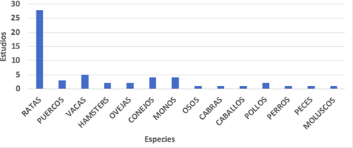 Por otra parte, se analizaron las especies de animales no humanos que se mencionan en los 50 estudios encontrados para esta investigación, arrojando como resultados que el 56% de ellos experimentó con ratas la mayoría de las cepas Wistar y Sprague Dawley, el 6% con puercos, el 10% con vacas, el 4% con hamsters, con ovejas y con pollos, el 8% con conejos y monos y el 2% con osos, cabras, caballos, perros, peces y moluscos (Figura 3).