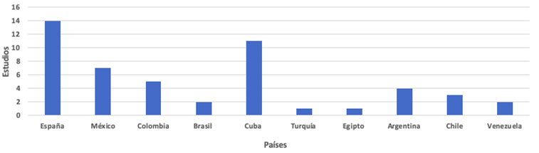 Los países que destacaron en la experimentación con animales en este análisis fueron: España (28%), Cuba (22%), México (14%), Colombia (10%), otros de los países que mencionan haber utilizado animales en sus investigaciones son; Argentina (8%), Chile (6%), Venezuela y Brasil (4%), Egipto y Turquía (2%) (Figura 4).