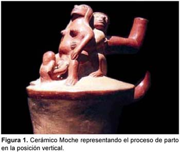 Hoy en día se sabe que muchos pueblos originarios, según representaciones en estatuillas y cerámicas, y hasta la edad media, utilizaron para el parto la posición vertical, sea en cuclillas o de pie, considerando que es la posición normal8,10. Los Moche nos han dejado una clara evidencia de esta posición y cuan importante fue la participación familiar en el parto, en sus ceramios se deja notar que en todo el proceso la madre es el personaje más importante, como observamos en la figura 1.