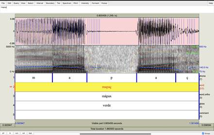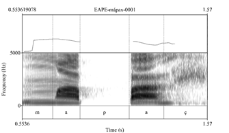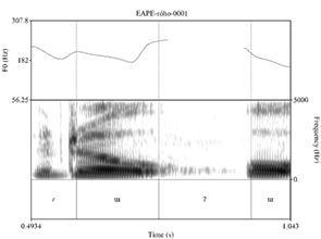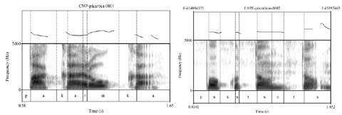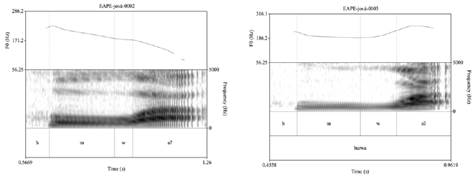 Un detalle acústico importante es que los tonos altos al final de una palabra bisilábica son marcadamente más altos que el tono precedente. Además, los tonos altos en esta posición previenen la glotalización de la vocal final, produciendo, en cambio, una realización segmental de la glotalización prosódica de final de enunciado que caracteriza al amahuaca (ver Zariquiey, Valenzuela y Angulo en prep. b). Por el contrario, las diferencias entre Ø y H pueden ser muy sutiles en las secuencias HØ. En algunos casos, de hecho, los valores de F0 de H y Ø pueden ser tan similares que un análisis posible sería sostener que no todas las palabras amahuaca tienen tono alto. Ello motivó el uso de tres niveles de anotación de tonos superficiales en vez de dos. Los patrones ØH, en realidad, son fáciles de identificar y de reconocer incluso por personas que no sean hablantes nativos de amahuaca y/o no tengan experiencia estudiando tonos7.