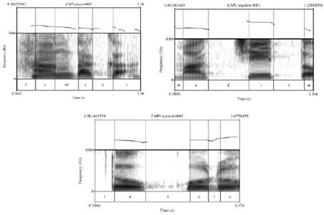 Figura 6 Pronunciación de ha3na2ka1 ‘manacaraco’ (DCZ), ma2ʧí3tu1 ‘machete’ (WCZ), tu1ku1ɾu3 ‘tipo de sapo’ (RRF)