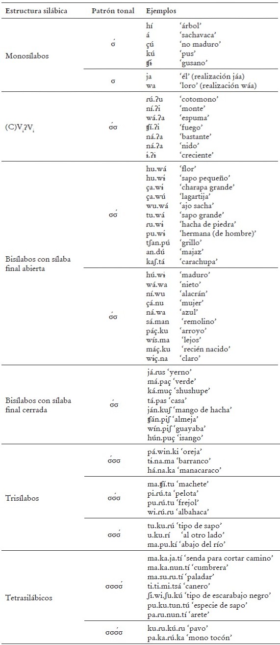 La posición del tono alto en palabras morfológicamente simples es nítidamente léxica, en el sentido de que un patrón silábico puede mostrar más de un patrón tonal y esto no es predecible. Sin embargo, las palabras bisilábicas que terminan en una sílaba cerrada, así como las palabras de tipo (C)ViʔVi, nunca llevan un tono alto final6. Todo esto se resume en la Tabla 3, donde presentamos e ilustramos todos los patrones tonales encontrados en los datos presentados en 4.1. Los casos en los que una estructura silábica se corresponde con más de un patrón tonal refuerzan la afirmación de la existencia de un tono léxico en amahuaca.